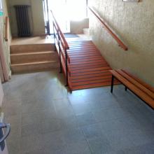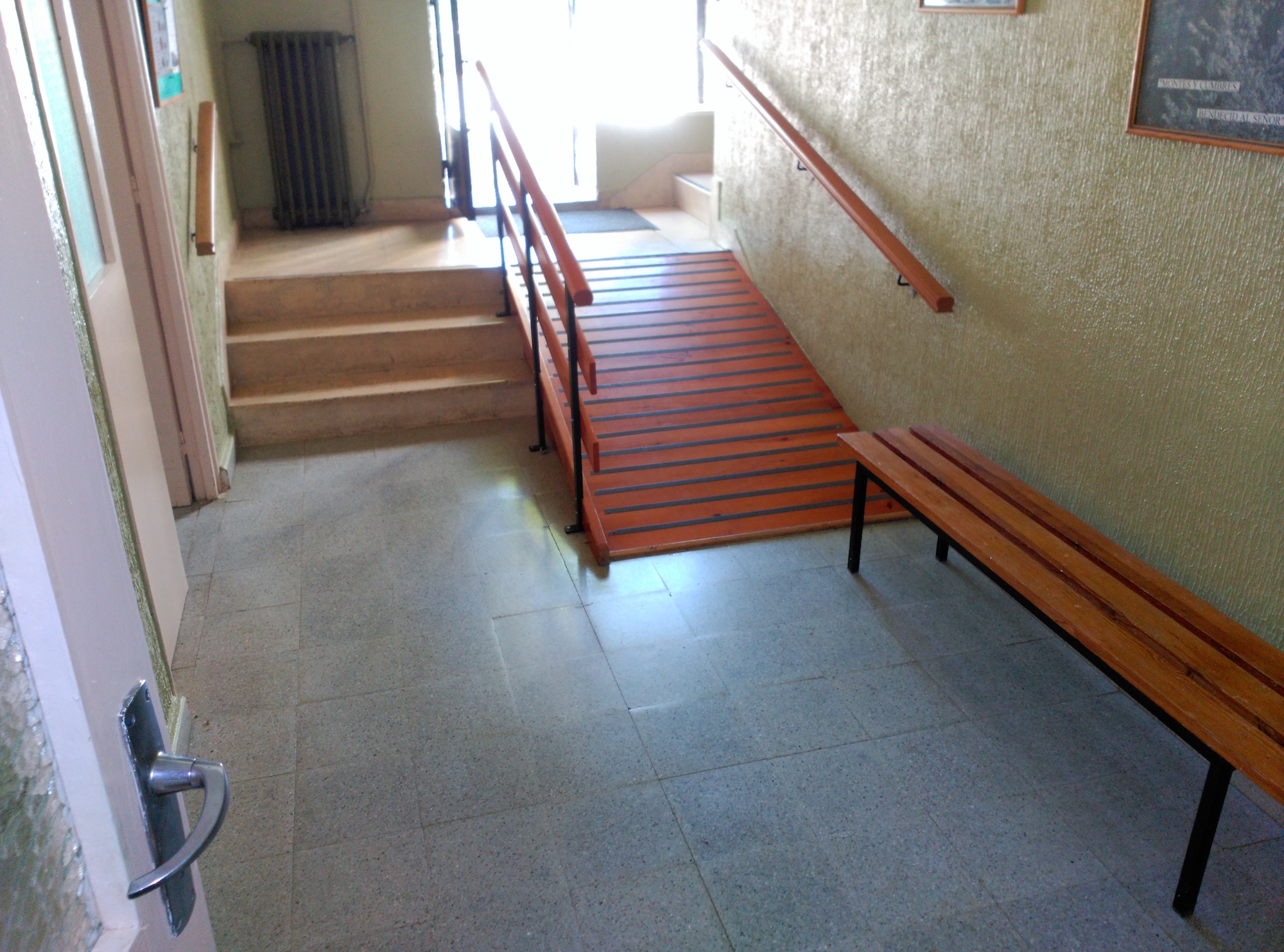 A través de la puerta del jardín de 95 cm. de anchura, hay dos accesos, una escalera que conduce a recepción y una puerta con un resalte de 5 cm y una rampa del 26 % de 1,07m de ancho.