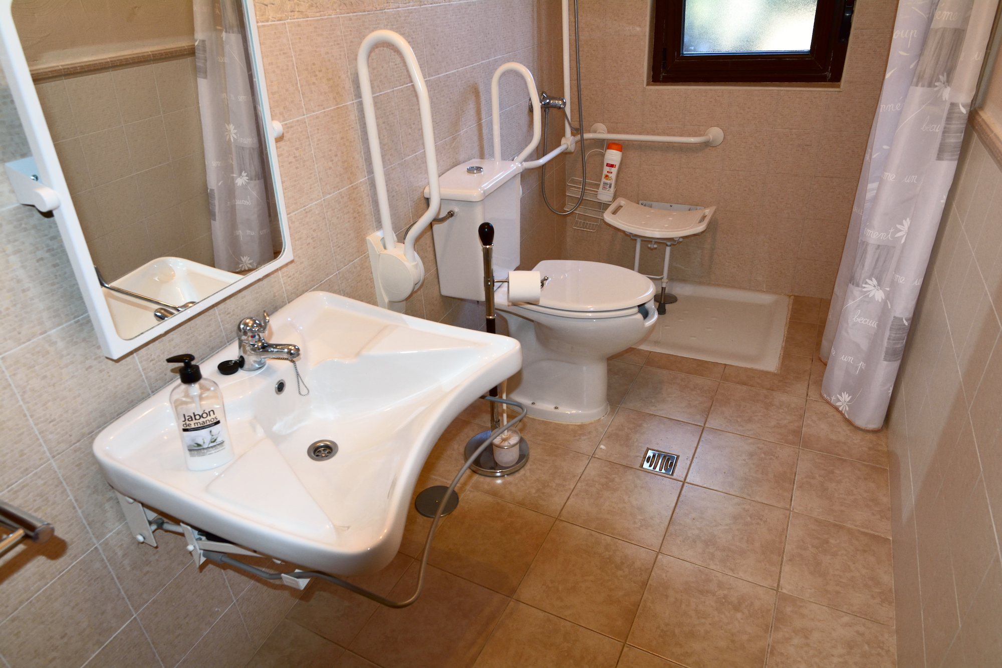 Los sanitarios están adaptados. Tiene espacio de transferencia y apoyos técnicos.