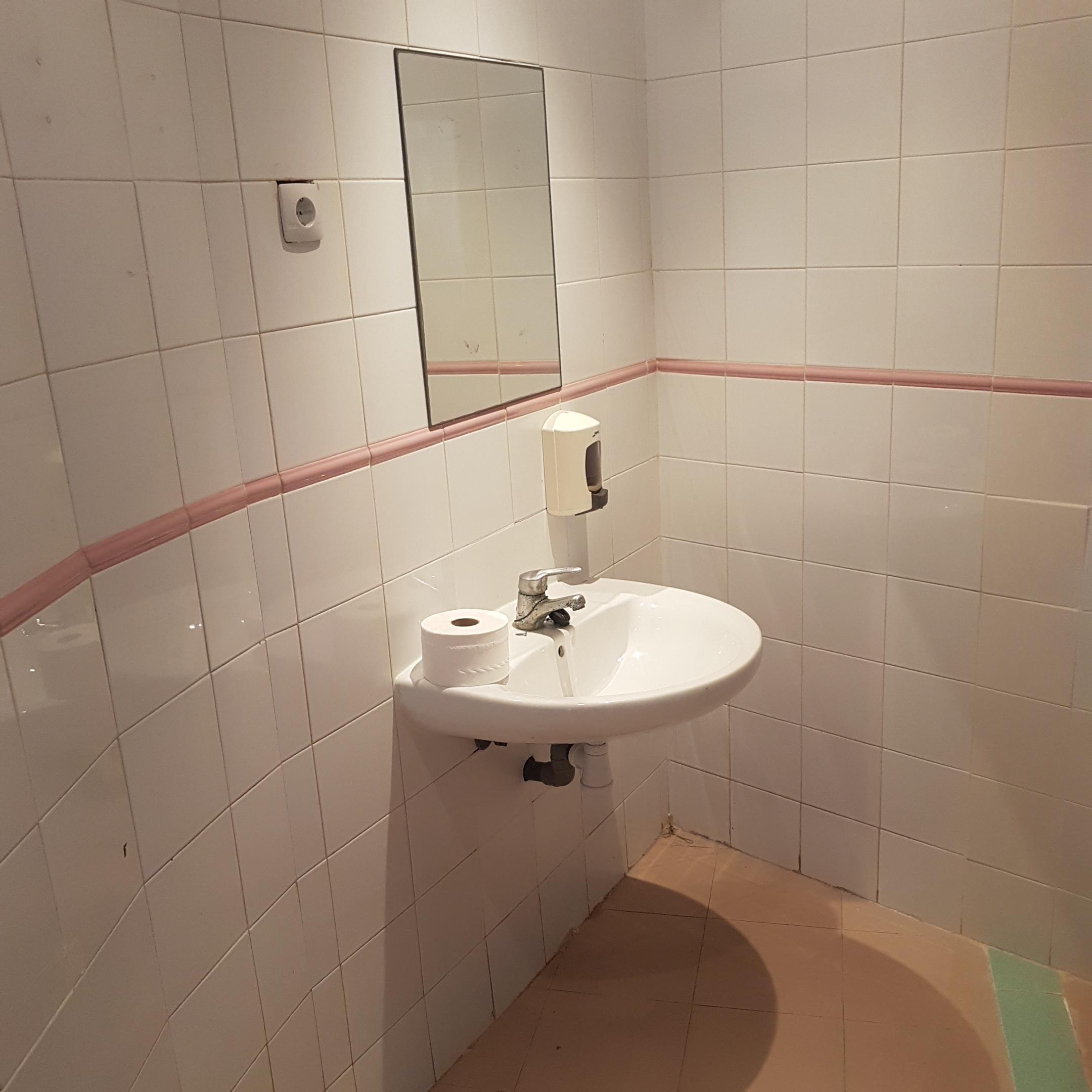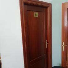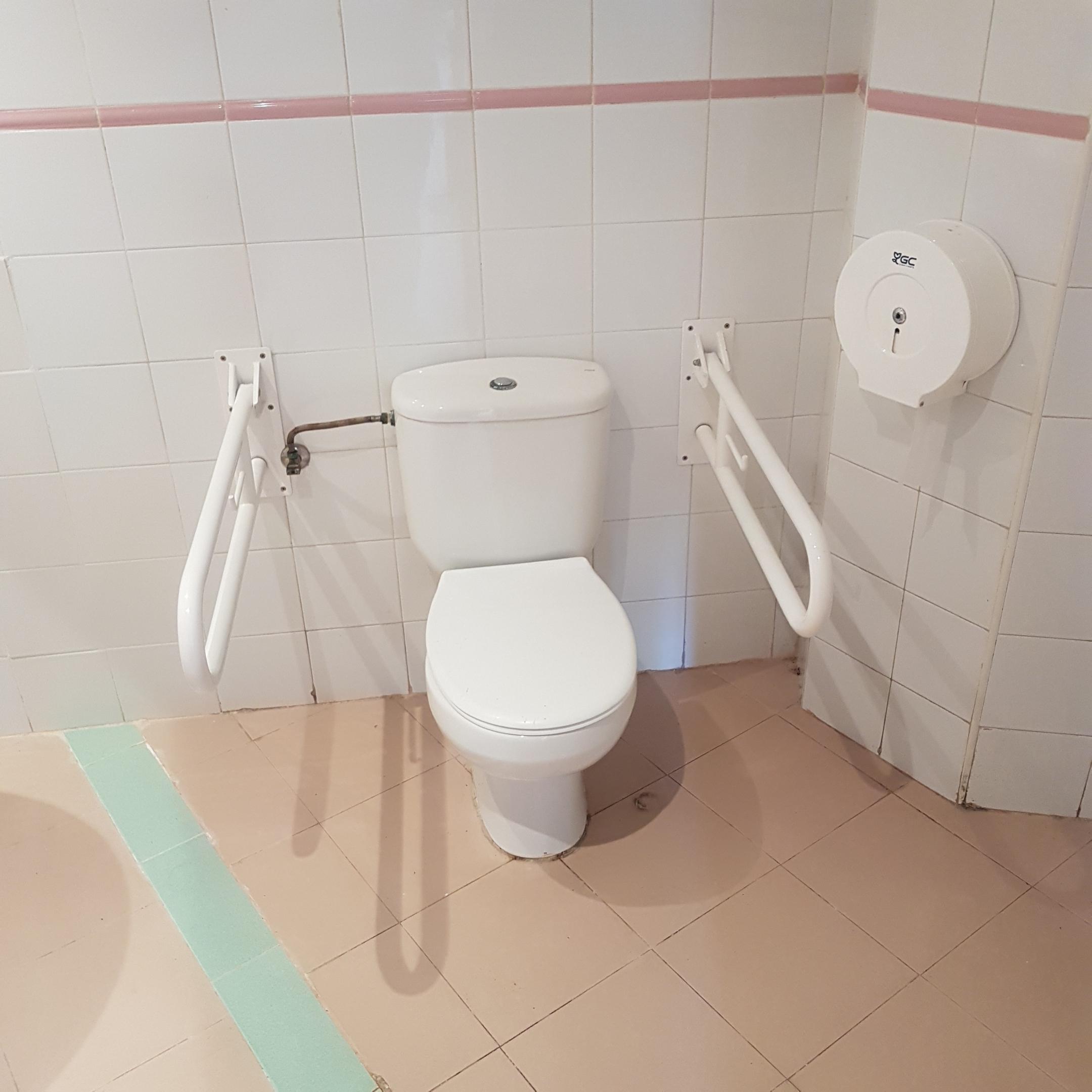 Adaptado, con ambas barras de apoyo, lavabo sin pedestal y radio de giro adecuado.