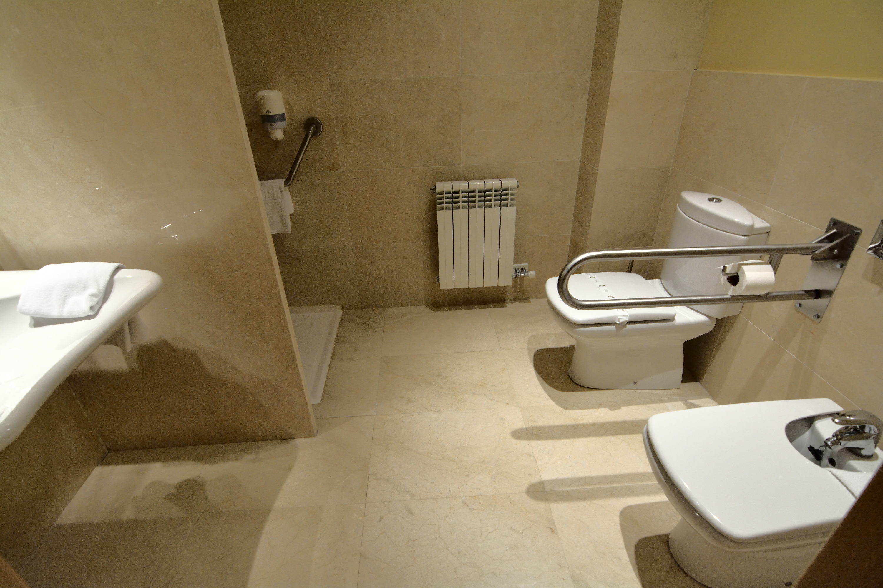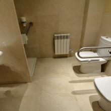 El plato de ducha está enrasado pero el espacio de uso es insuficiente al haber un tabique. Dispone de grifo monomando y rociador fijo y extensible. Tiene apoyos técnicos. Dispone de asiento de ducha.