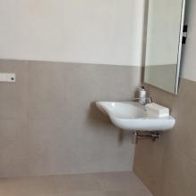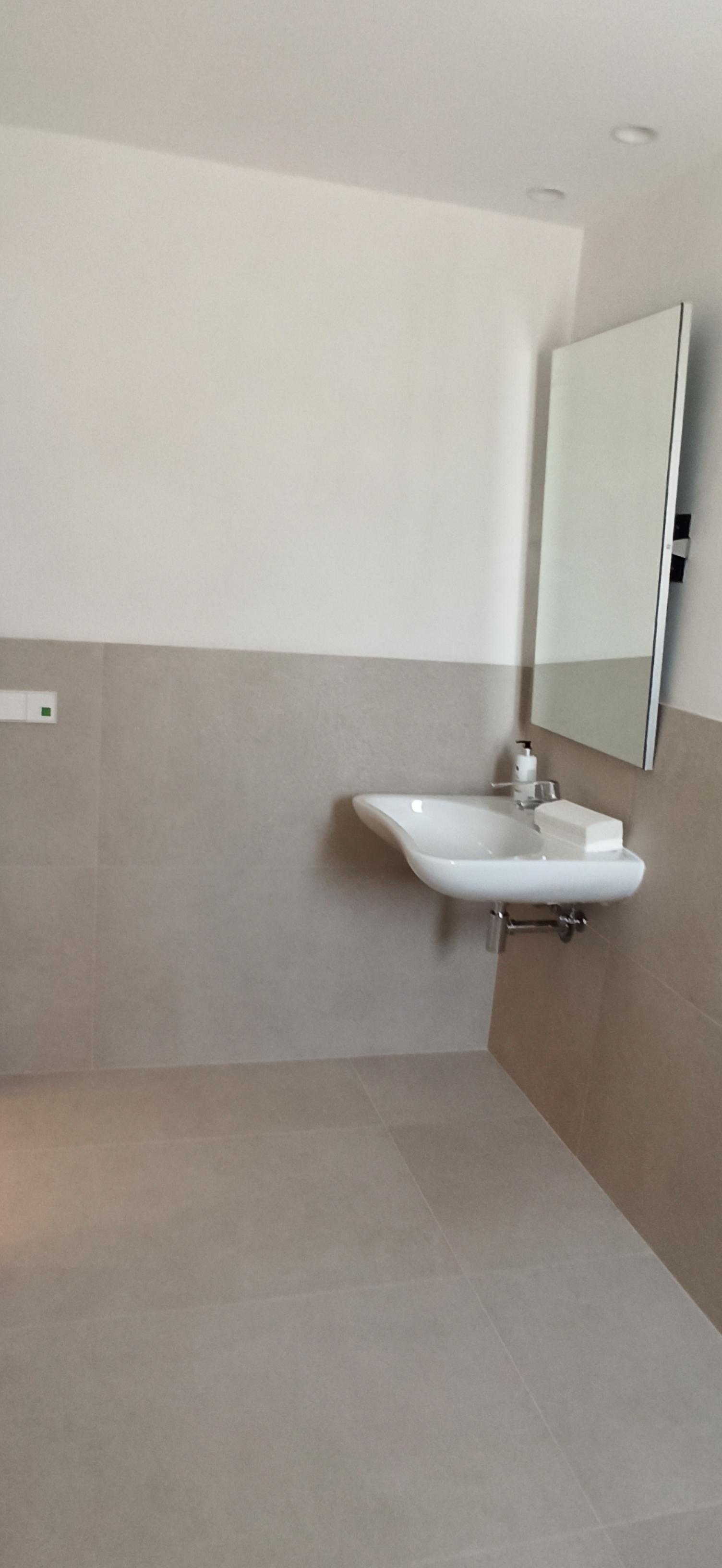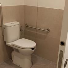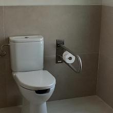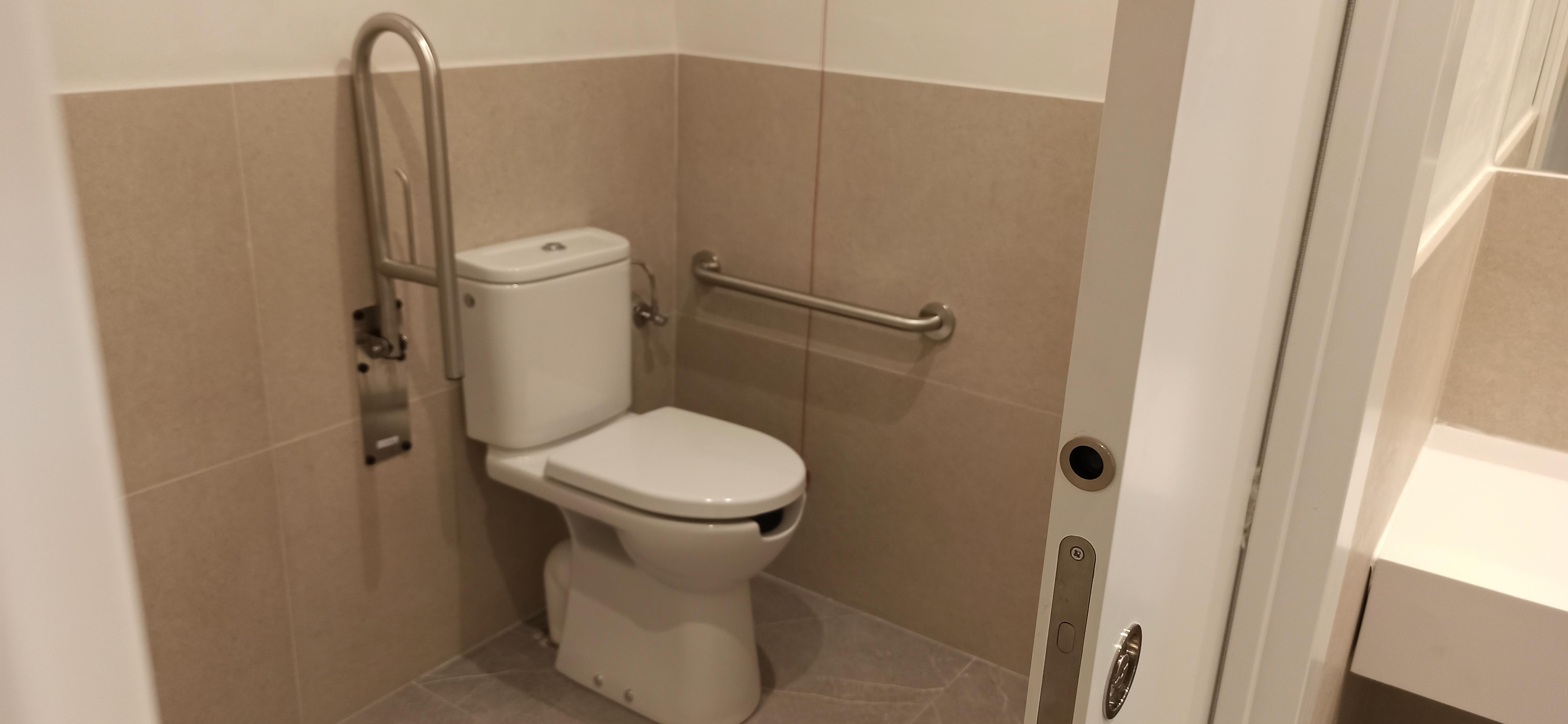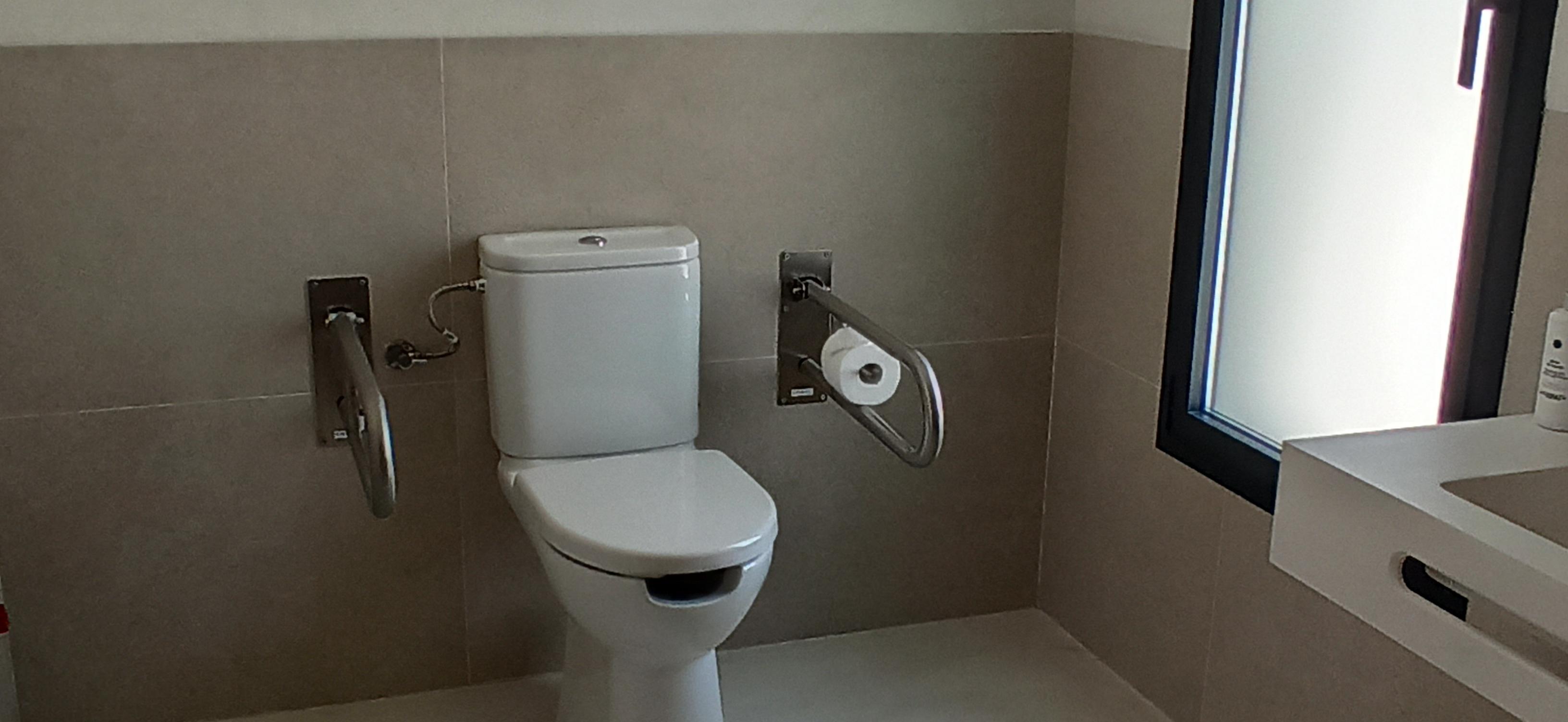 Cumplen todos los aparatos en disposición y altura correcta. Lavabo con grifo de palanca de fácil accionamiento, espejo inclinado facilitando la mejor visión. El inodoro cumple el espacio de transferencia y apoyos