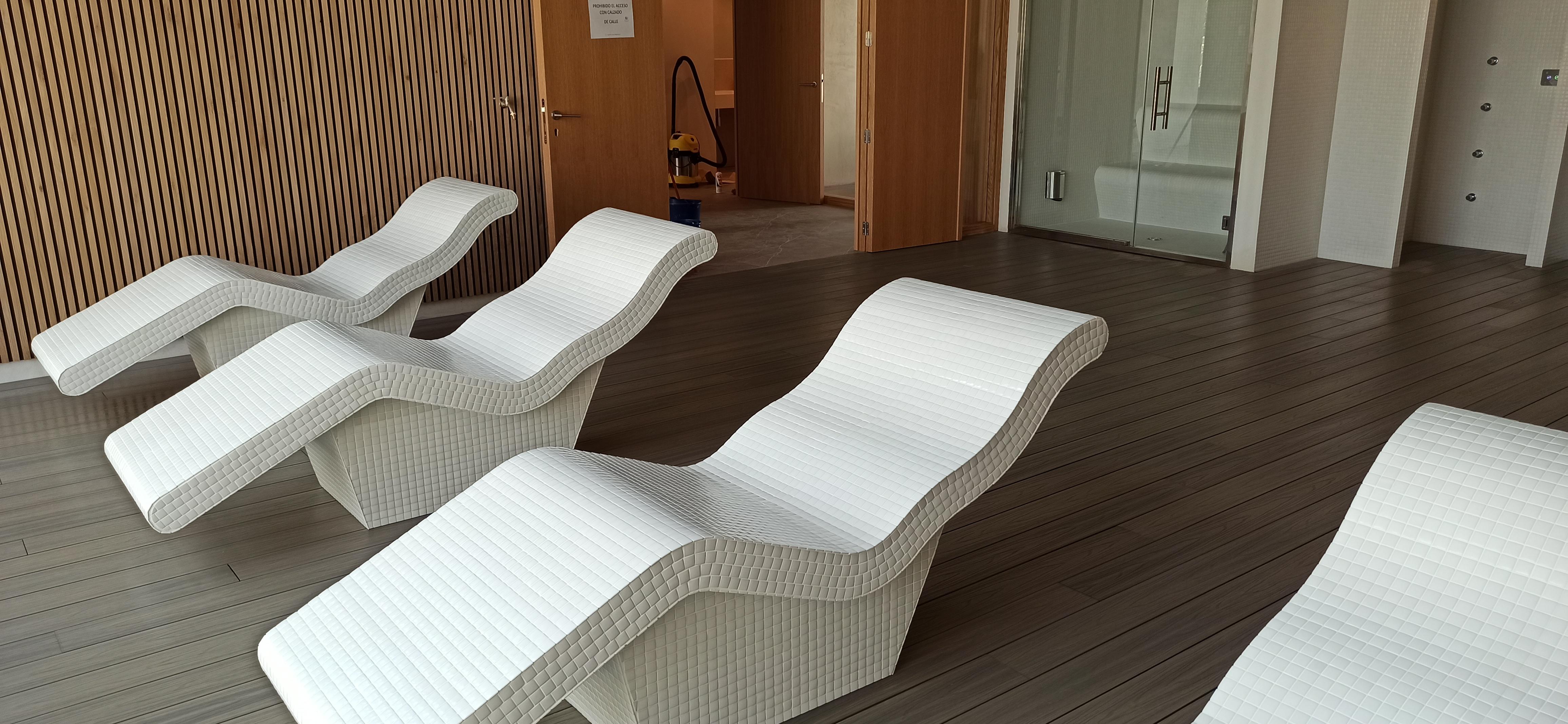 Existen varias zonas de descanso accesibles, como pueden ser el jardín, terraza , espacio Wellness en el que hay una sala de masajes accesible, baño turco, ducha escocesa y sauna no accesibles al tener un pequeño resalte para poder acceder.