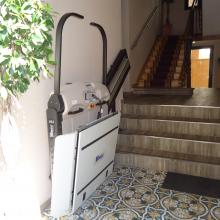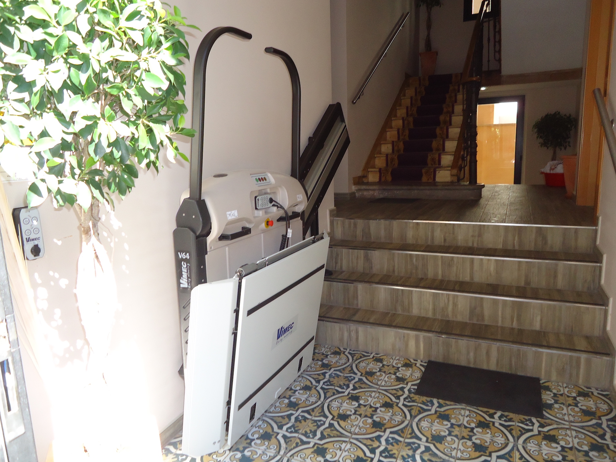 Desde el aparcamiento a través de un terreno en pendiente (2,5 %), caminando a través de una fuerte rampa, hasta la puerta automática accesible sin resaltes ni obstáculos.
