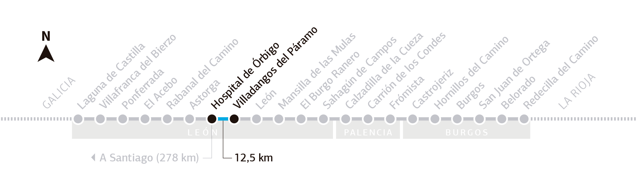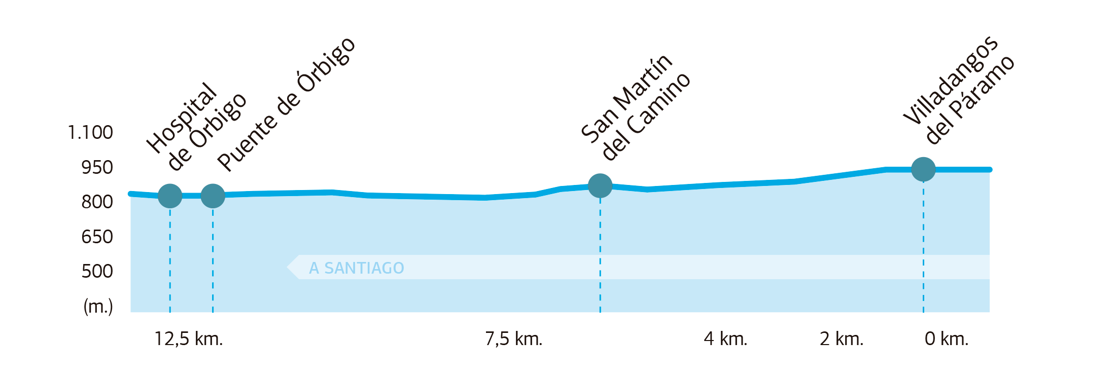 Para los peregrinos que en la etapa de ayer terminaron en Villadangos del Páramo, hoy tendrán un tranquilo paseo que, a un ritmo normal, pueden terminar en unas tres horas. Por ello hoy puede ser un día apropiado para disfrutar un ratito más de la cama.A los 4,5 km de recorrido llegaremos a San Martín del Camino, único municipio que atravesaremos en el día de hoy. Como tantos otros pueblos por los que hemos pasado, su nombre hace referencia a la ruta jacobea y esta vez va unido San Martín de Tours, quizá, después de Santiago, el santo con mayor veneración en todo el Camino.