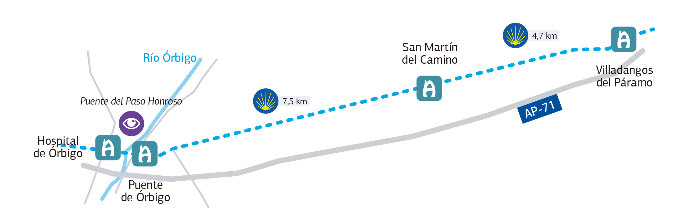 A los largo de su historia podemos encontrar varios momentos importantes como las guerras en el siglo V entre Suevos y Visigodos. Las batallas contra los musulmanes en la reconquista o más recientemente durante la Guerra de la Independencia cuando los vecinos destruyeron el inicio del puente para impedir el paso de las tropas francesas.El núcleo original fue Puente de Órbigo. En el siglo XII al otro lado del río se construirá una iglesia y un hospital, que será gestionado por la Orden de Caballeros de San Juan de Jerusalén. La buena gestión hará que se vayan levantando casas, comercios, posadas…, que con el tiempo darán forma al actual Hospital de Órbigo.Pero sin duda lo más característico y lo que ha hecho famoso a estas localidades es el puente medieval, declarado Monumento Nacional. Se trata de uno de los puentes más conocidos de todo el Camino. Está formado por 19 ojos, aunque ha sufrido muchas modificaciones y sólo queda una pequeña parte del original. La fama del puente le viene dado por la historia del caballero leonés Don Suero de Quiñones. Durante el siglo XV este caballero que formaba parte de las huestes de Don Álvaro de Luna, Condestable de Castilla, protagonizará una de las más bonitas aventuras del Camino.Don Suero, locamente enamorado de Doña Inés de Tovar, para hacer notar su amor a la dama, solía pasearse con una argolla de hierro al cuello demostrando ser su esclavo de amor. Como mayor demostración y para poder librarse de tal esclavitud, pidió permiso al Rey Juan II para que le dejase retar a todos los caballeros que se atreviesen a pasar el puente. Así durante un mes y ayudado por sus nueve mejores hombres, lograron derrotar a 300 caballeros, de los que únicamente uno murió al atravesarle la lanza un ojo.Tras esta proeza los 10 caballeros peregrinaron a Compostela y desde ese momento al puente se le conoce como El Paso Honroso. A la entrada del puente hay un monolito con el nombre de los 10 caballeros. Incluso en el Quijote se hace referencia a esta historia.Todos los años a primeros de junio se hace una recreación de estas Justas, acompañadas de un mercado medieval, que hacen más que recomendable una visita a estas tierras.