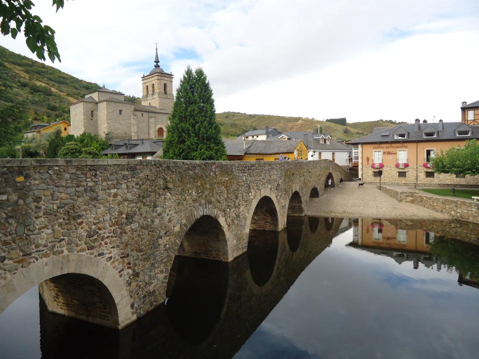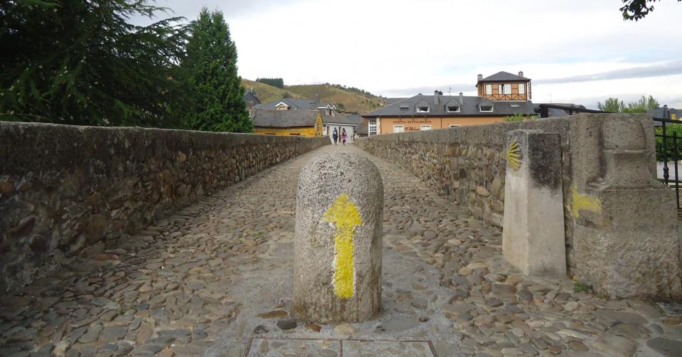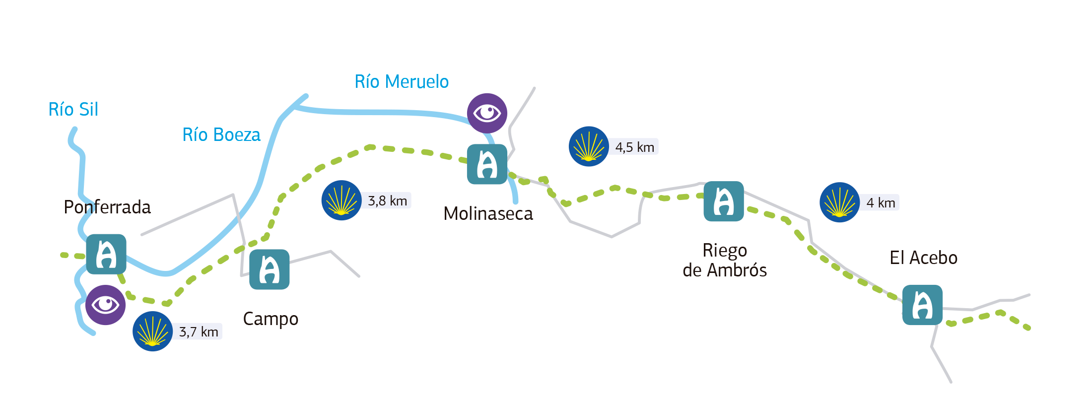 Además del albergue, también puedes alojarte en la Pensión Riego de Ambros (987 695 188)Continuamos con 4,5 km de descenso hasta Molinaseca, en los que todavía tendremos dos zonas donde la pendiente es peligrosa. Molinaseca es un precioso pueblo que conserva en su casco antiguo su encanto medieval. Permanecen en pie nobles edificios con sus escudos, recuerdos de épocas anteriores, como el Palacio de los Balboa o la casa donde vivió Doña Urraca. El pueblo esta dividido en dos zonas, separadas por aproximadamente un km.Unos metros después nos encontramos con otro de los buenos puentes del Camino. En este caso es un ejemplar románico del s XII, aunque ha sufrido posteriores reformas y ampliaciones. Como curiosidad al lado del puente, en el río Meruelo, tenemos la única playa con piscina fluvial que nos vamos a encontrar en el Camino Francés. A parte de las Angustias, la localidad cuenta también con la Iglesia de San Nicolás, de inicio románico pero muy reformada en el XVII. En el interior hay una buena talla gótica de Jesús crucificado. En temporada, abre una oficina de turismo, tf: 987 453 085.Molinaseca es cada vez la opción más utilizada para pernoctar de aquellos peregrinos que evitan las grandes ciudades como Ponferrada. Para ellos recomendaremos el Hostal el Palacio, por cumplir los requisitos de accesibilidad. Está situado en la C/ El Palacio, 19. Dispone de 18 plazas con habitaciones individuales a 35 € y dobles a 45. Pueden hacer triples y cuádruples. Además cuenta con un restaurante con interesantes menús de peregrino. Tf: 987 433 094.Los dos albergues los encontramos en el segundo caserío de Molinaseca, aproximadamente a un km del otro.A la salida del pueblo es donde tendremos que escoger la forma de entrada a Ponferrada. Para las personas con movilidad reducida les recomendamos seguir la carretera hasta el final de etapa. Para el resto tomar el desvío hacia Campo. El frme está en muy malas condiciones para meter una silla de ruedas. Desde Molinaseca a Campo hay algo menos de 4 km. Campo ya pertenece al término municipal de Ponferrada y cuenta con unos 400 habitantes. Es otro de los pueblos que también tuvo Hospital para peregrinos, pero no queda ni rastro. En cambio si que se conservan algunas casas del siglo XVII de mampostería.Lo más destacable es la Iglesia de Santa María del Camino, que se encuentra a las afueras del pueblo y que a su lado mantiene una encina centenaria. Del interior hay que reseñar una imagen de la Virgen de la Encina.
