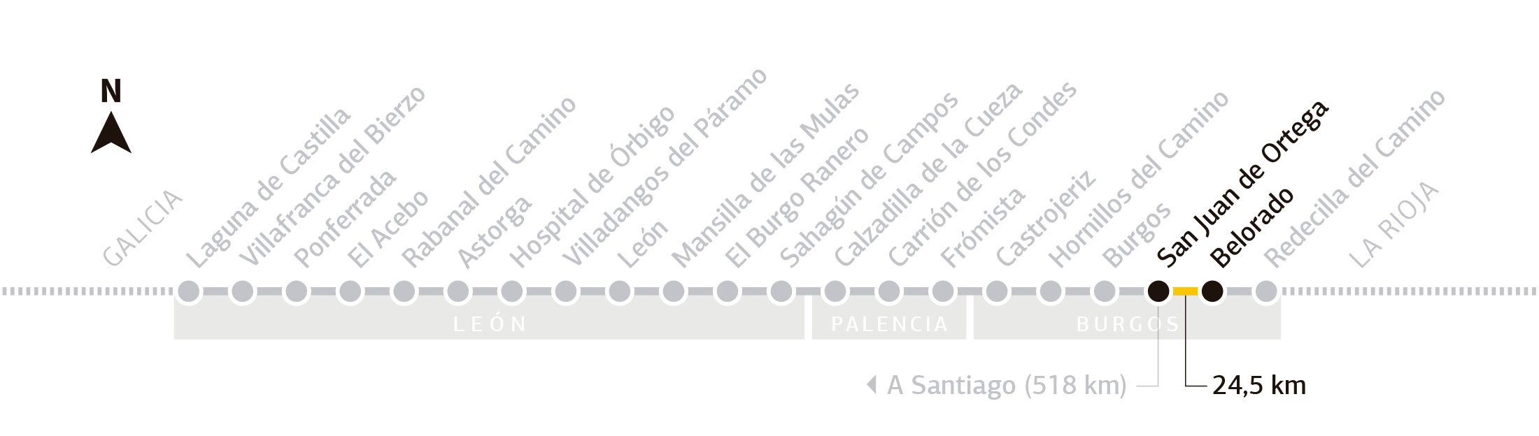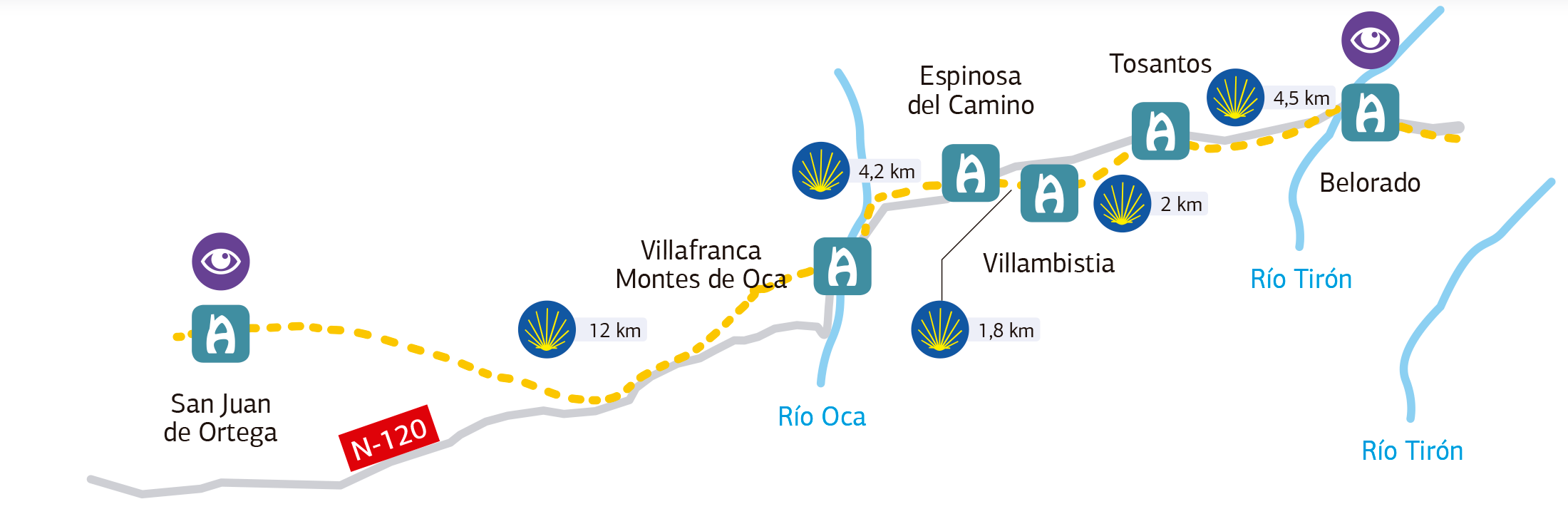 4,2 km separan Espinosa del Camino de Villafranca Montes de Oca . Hay que tener especial cuidado al entrar en este municipio pues hay un pronunciado descenso y los últimos metros del camino vas por la carretera N-120.