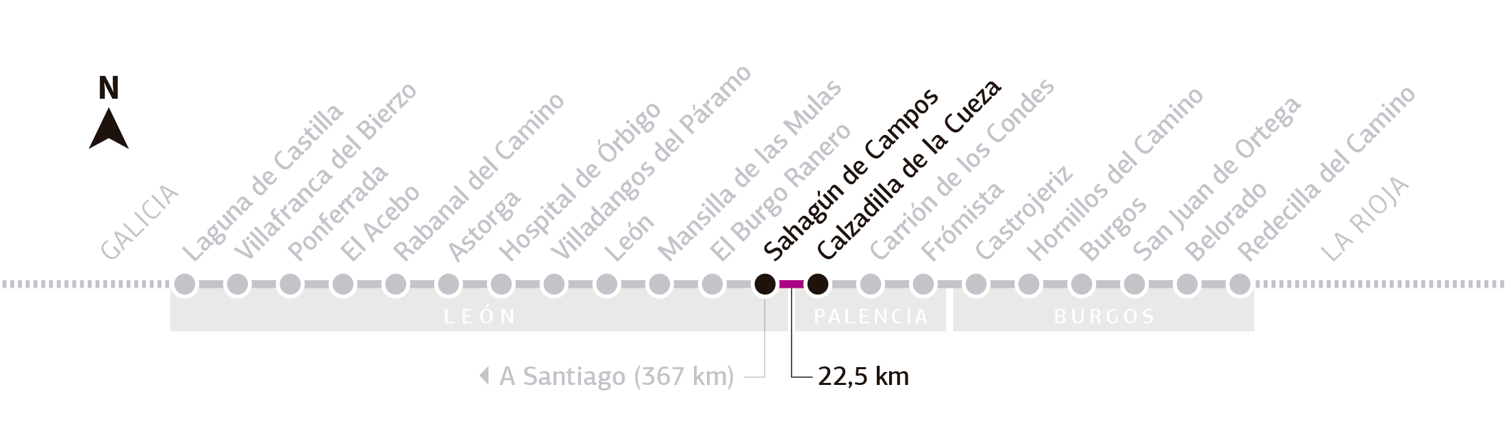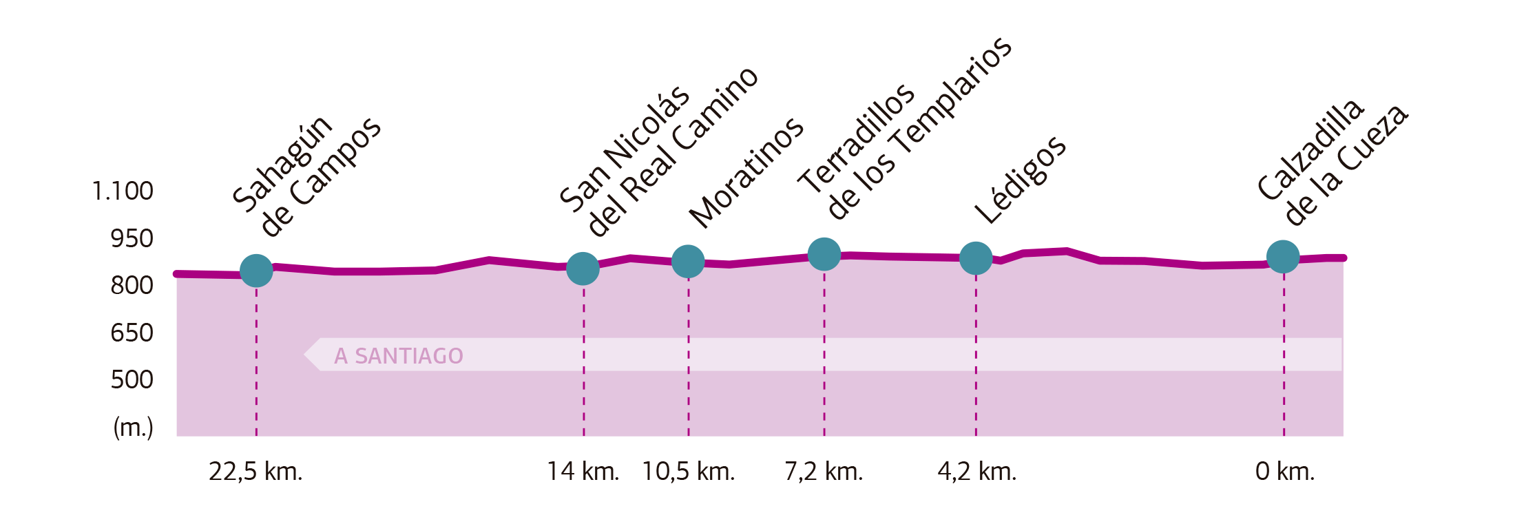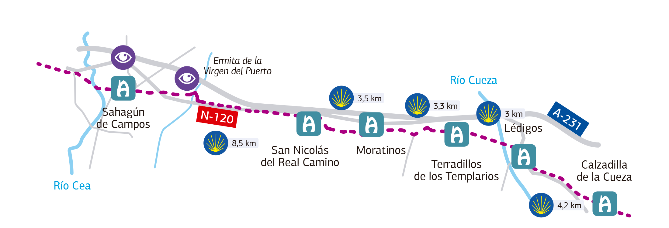 En la etapa de hoy abandonaremos las tierras palentinas para terminar en Sahagún, provincia de León.Los 22,5 Km de la jornada van a ser relativamente cómodos. Al contrario que en el día de ayer en la que la monotonía era la nota predominante, para hoy entre Calzadilla de la Cueza y Sahagún, vamos a tener que atravesar cuatro pueblos. El inconveniente que encuentro a nuestra ruta es la continua presencia de la carretera, que afea bastante el recorrido.
